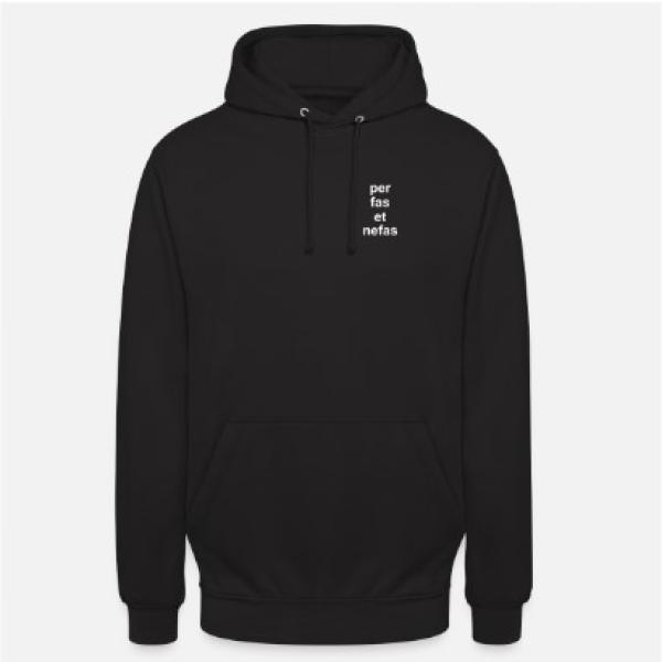 Auf der Vorderseite ist das per fas et nefas-Logo auf Herzhöhe platziert. Den Rücken ziert in weißer Schrift der Slogan "a cut above the rest".