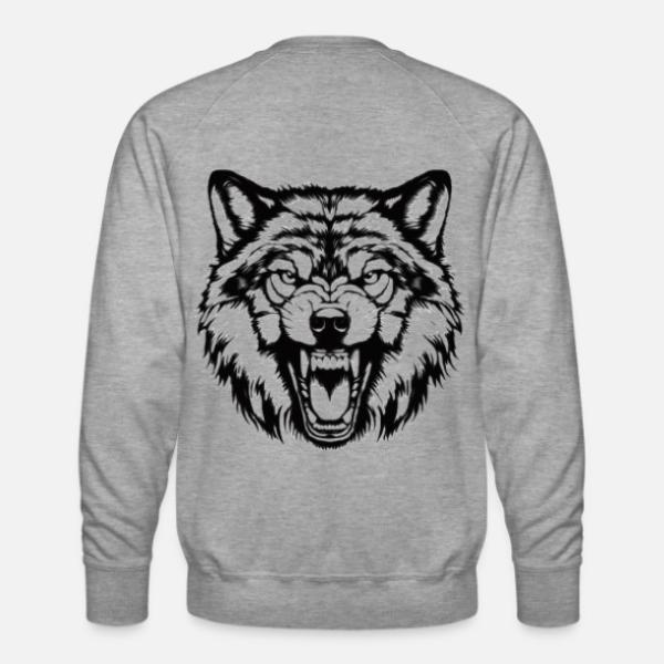 Auf der Vorderseite ist das per fas et nefas-Logo auf Herzhöhe platziert.Den Rücken ziert in schwarz das Gesicht eines aggressiven Wolfes.