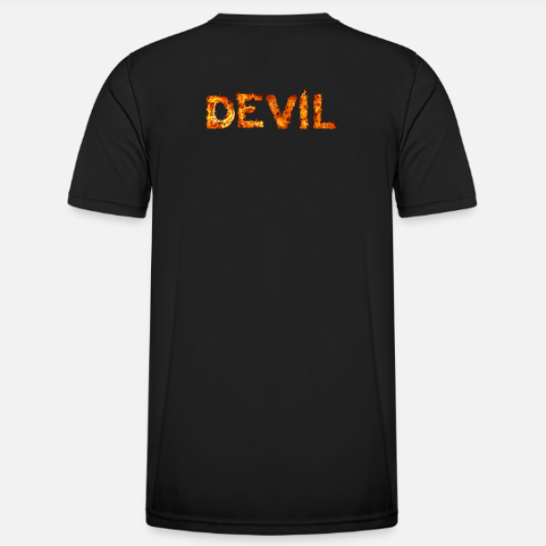 Auf der Vorderseite ist das per fas et nefas-Logo auf Herzhöhe platziert. Den Rücken ziert in spezieller dunkelroter Schrift das Wort "DEVIL".