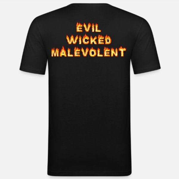 per fas et nefas logo is placed at heart level. The back features the slogan "EVIL WICKED MALEVOLENT" in special colored lettering.