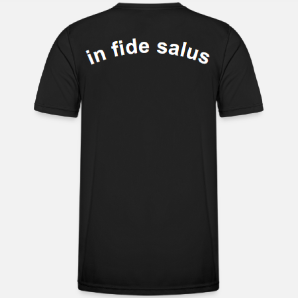 On the front, the per fas et nefas logo is placed at heart level. The back features the slogan "in fide salus" in white lettering.